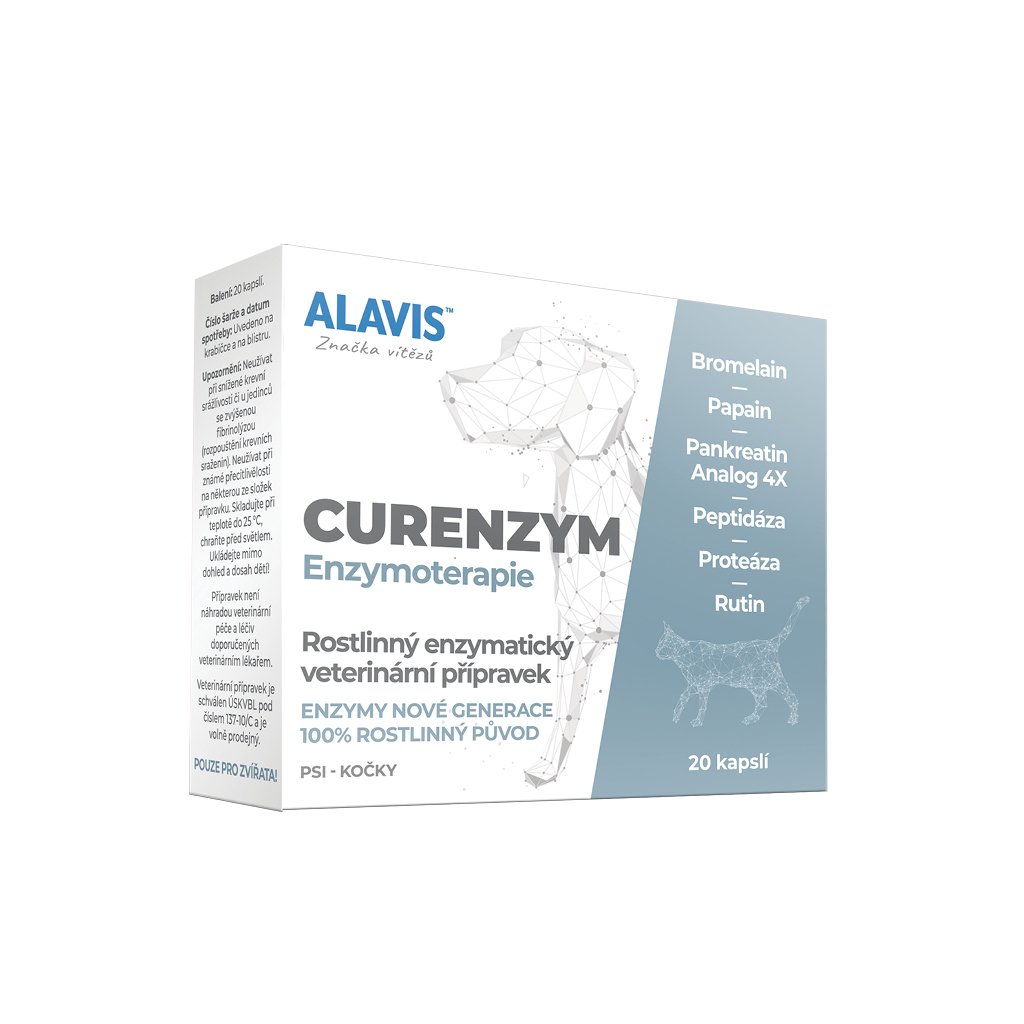 ALAVIS Curenzym Enzymoterapie je veterinární přípravek pro psy a kočky obsahující speciálně vybranou směs rostlinných enzymů, které podporují imunitní systém, regeneraci tkání a hojení organismu.