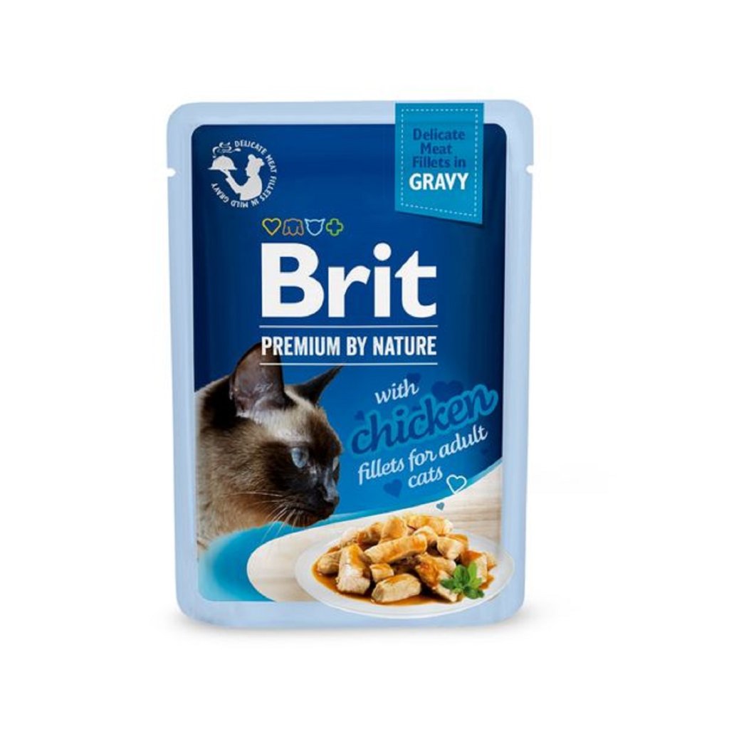 BRIT Premium Cat D Fillets in Gravy with Chicken 85 g je lahodné superprémiové mokré krmivo pro dospělé kočky ve formě jemně krájených masových filetek v lahodné šťávě. Filetky mají strukturu podobnou trhanému masu, což kočkám přináší ještě autentičtější chuťový zážitek.