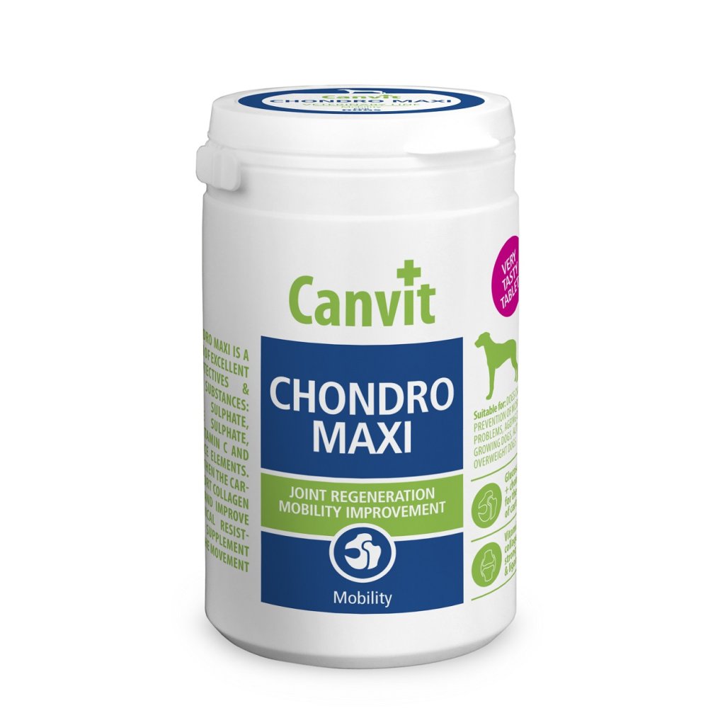 Canvit Chondro Maxi je účinné chondroprotektivum určené speciálně pro velká a obří plemena psů. Kombinuje osvědčené látky podporující zdraví kloubů – glukosamin, chondroitin, hydrolyzovaný kolagen, vitamín C a organicky vázané minerály. To vše ve formě chutných játrových tablet, které psi milují!