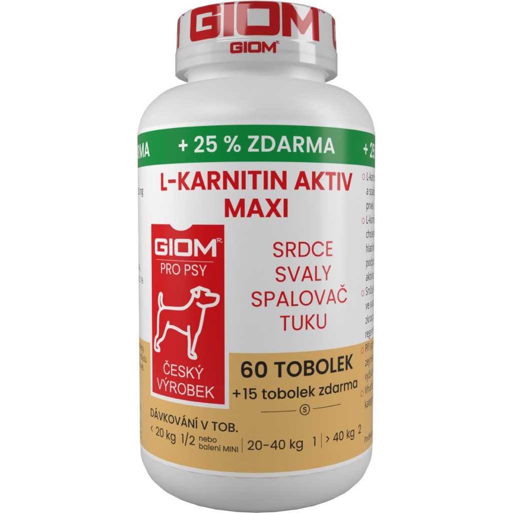 GIOM ERA L-karnitin Aktiv 60 MAXI 60 tbl je český doplněk stravy, který podporuje spalování tuků, fyzickou kondici a regeneraci svalů. Ideální pro sportovní, pracovní i aktivní psy.