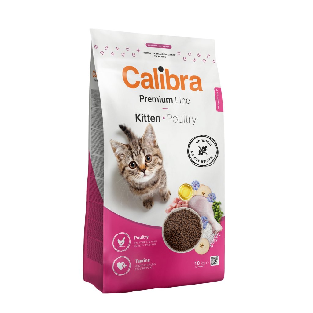 Calibra Cat Premium Line Kitten Poultry 10 kg je kompletní a vyvážené prémiové suché krmivo speciálně vyvinuté pro koťata do 12 měsíců, březí a kojící kočky. Granule s drůbežím masem bez obsahu pšenice a sóji kombinují vysoký podíl čerstvého masa s kvalitními živočišnými proteiny, které zajišťují optimální růst a správný vývoj vašeho kotěte.