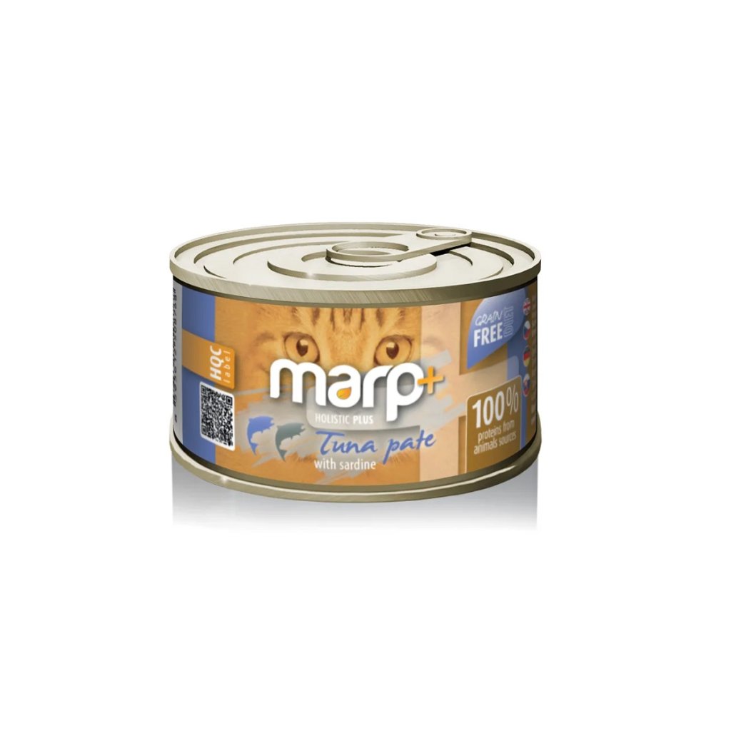 🐟 Marp Holistic Plus – Tuňákové paté se sardinkami v paté formě je špičkové doplňkové krmivo pro kočky, které v sobě spojuje výbornou chuť a kvalitní složení. Základem receptury je tuňák, doplněný o kousky sardinek, díky nimž je paté nejen chutné, ale i výživné.