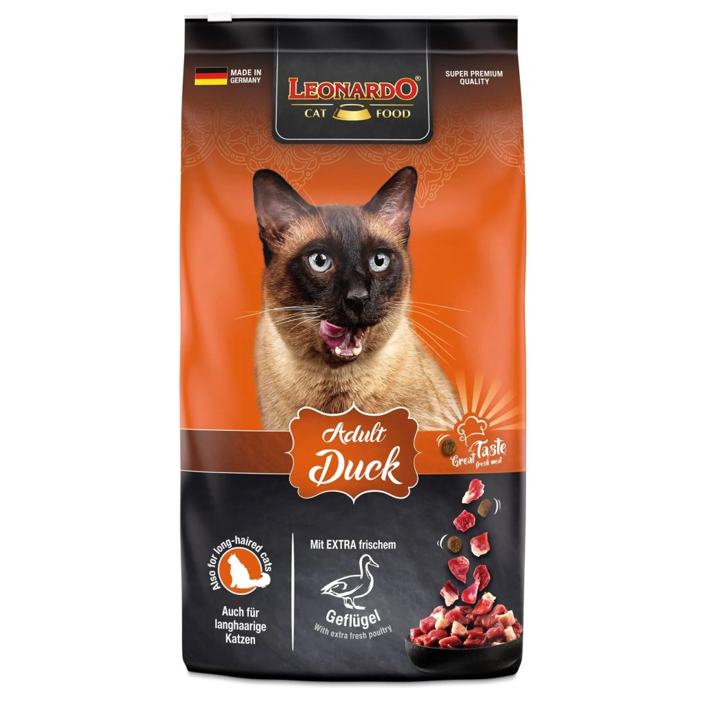 LEONARDO Adult Duck je kompletní prémiové krmivo určené pro dospělé a aktivní kočky, které mají vyšší nároky na energii a kvalitu bílkovin. Základem receptury je kachní maso v kombinaci s čerstvým drůbežím masem, které zajišťují výbornou chutnost a vysokou stravitelnost.