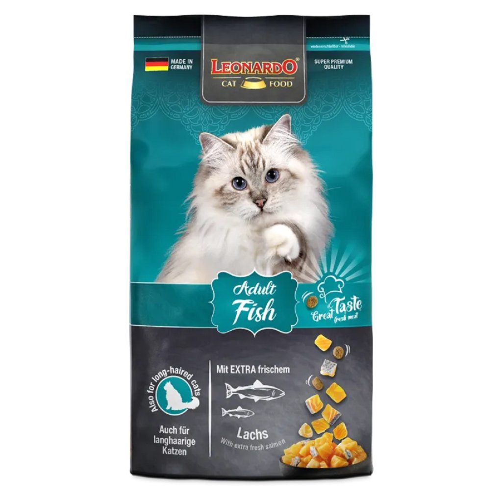 LEONARDO Adult Fish je kompletní krmivo určené pro dospělé kočky všech plemen, které preferují rybí chuť a potřebují kvalitní živočišné bílkoviny s vysokou stravitelností. Základem receptury je 30 % čerstvého lososa, doplněného o rybí moučku z mořských ryb a mořský zooplankton (krill), které dodávají kočce cenné proteiny, minerály a esenciální mastné kyseliny.