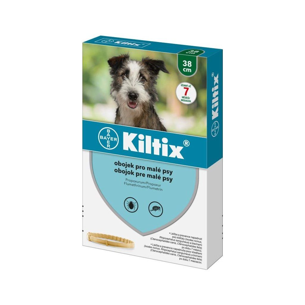 BAYER KILTIX antiparazitní obojek 38 cm je veterinární přípravek určený k dlouhodobé ochraně malých psů před blechami a klíšťaty. Obojek je vhodný pro psy s obvodem krku do 38 cm a poskytuje spolehlivou ochranu až po dobu 7 měsíců.