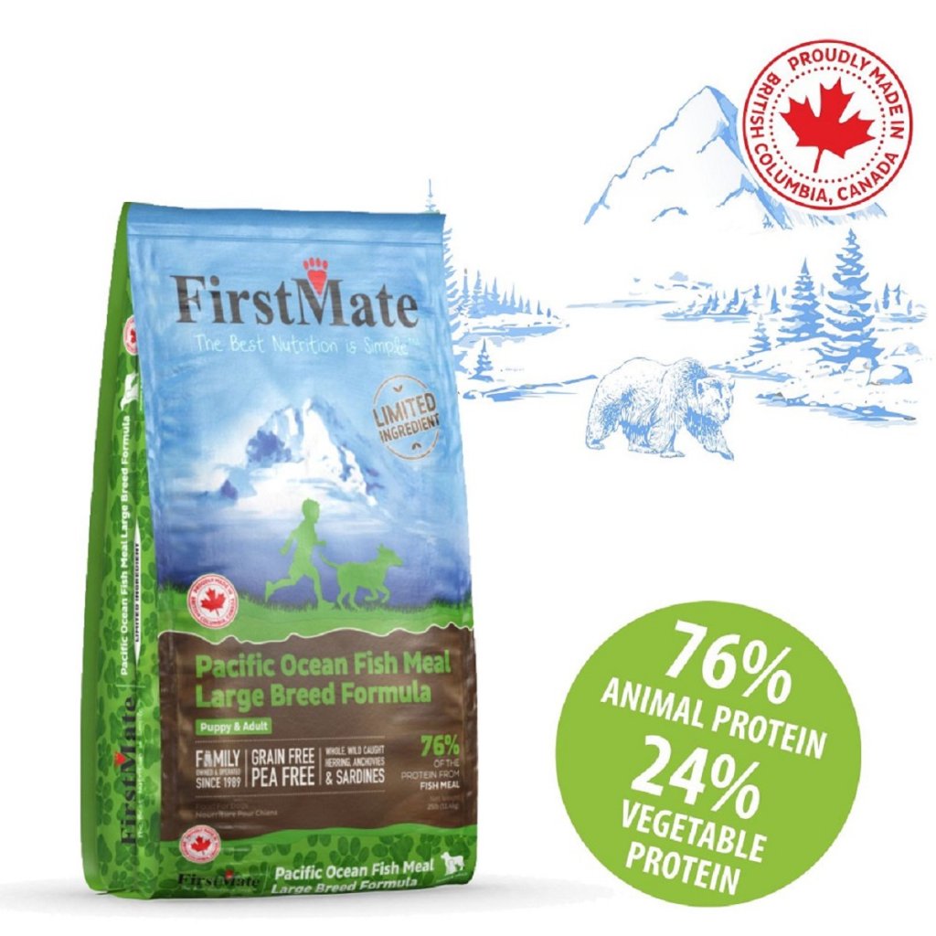 FirstMate Pacific Ocean Fish Large Breed je kanadské ultraprémiové krmivo vytvořené speciálně pro potřeby velkých a obřích psů. Jednoduché složení s jedním zdrojem živočišných bílkovin z oceánských ryb pomáhá minimalizovat riziko potravinových alergií a podporuje snadné trávení.