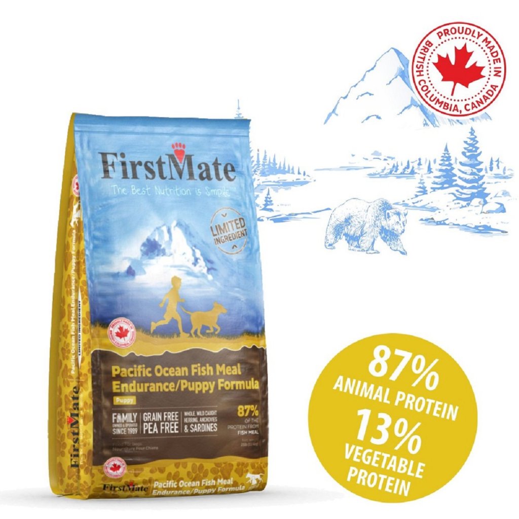FirstMate Pacific Ocean Fish Puppy je kanadské ultraprémiové krmivo určené pro období intenzivního růstu a zvýšených nároků na energii. Hlavním zdrojem bílkovin je moučka z oceánských ryb, přirozeně bohatá na omega-3 mastné kyseliny (DHA a EPA), které podporují správný vývoj mozku, kloubů a srsti.