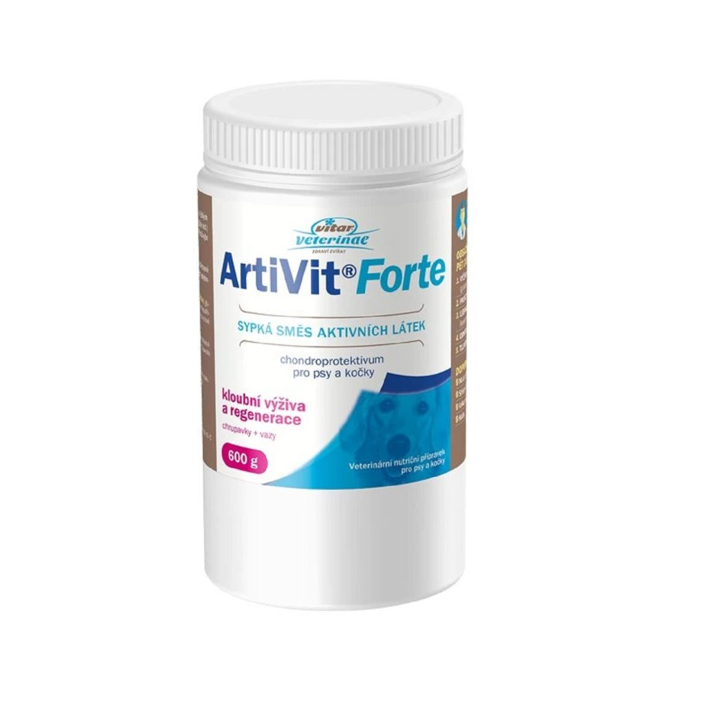 Artivit Forte plv. 600g od značky VITAR (Nomaad) je veterinární nutriční doplněk – chondroprotektivum pro psy a kočky, který kombinuje ověřené aktivní látky pro kompletní péči o pohybový aparát.