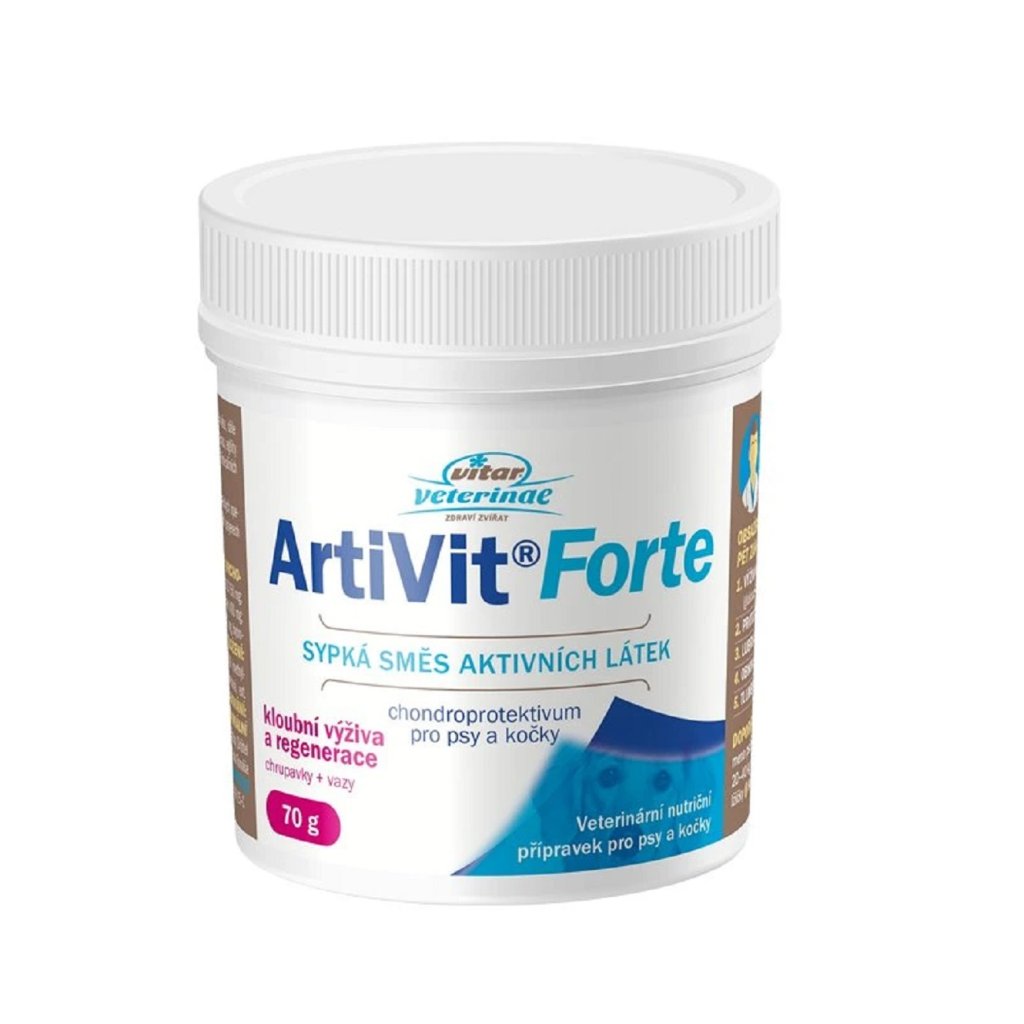 Artivit Forte plv. 70g od značky VITAR (Nomaad) je veterinární nutriční doplněk – chondroprotektivum pro psy a kočky, který kombinuje ověřené aktivní látky pro kompletní péči o pohybový aparát.